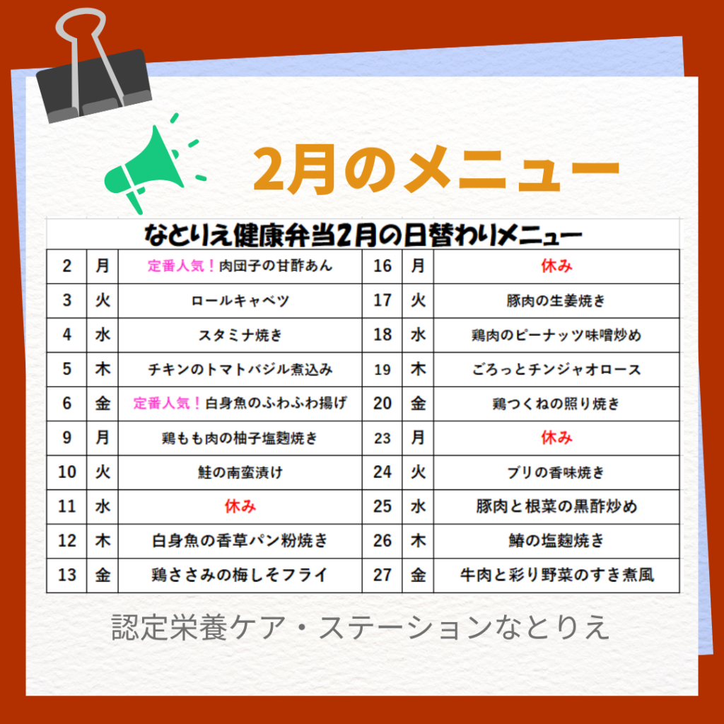 なとりえ健康弁当では、2月も栄養バランスとおいしさの両立を大切に、日替わり献立をご用意しています。